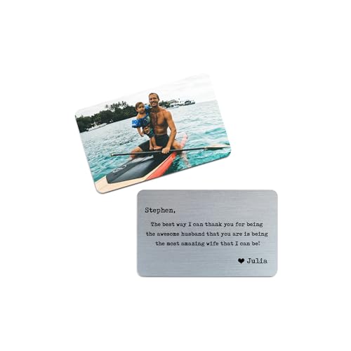 A small engraved metal card he can carry every day—a private love note that stays close.